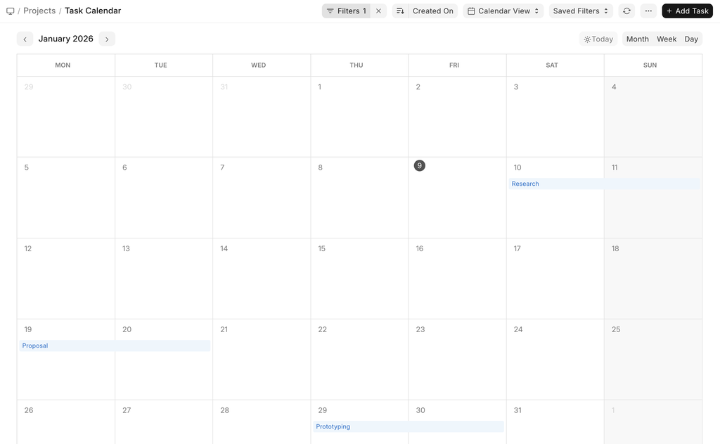 Like the Gantt chart, the calendar view also shows the task and the planned number of days it'll take to complete. However, this one shows the task spread across your regular calendar.