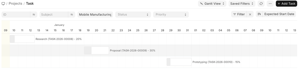 Apart from the generic list and report views for projects and tasks, ERPNext also provides Gantt, Kanban, and Calendar views for tasks. You can access these views by going to the Task list and selecting them via the left sidebar.