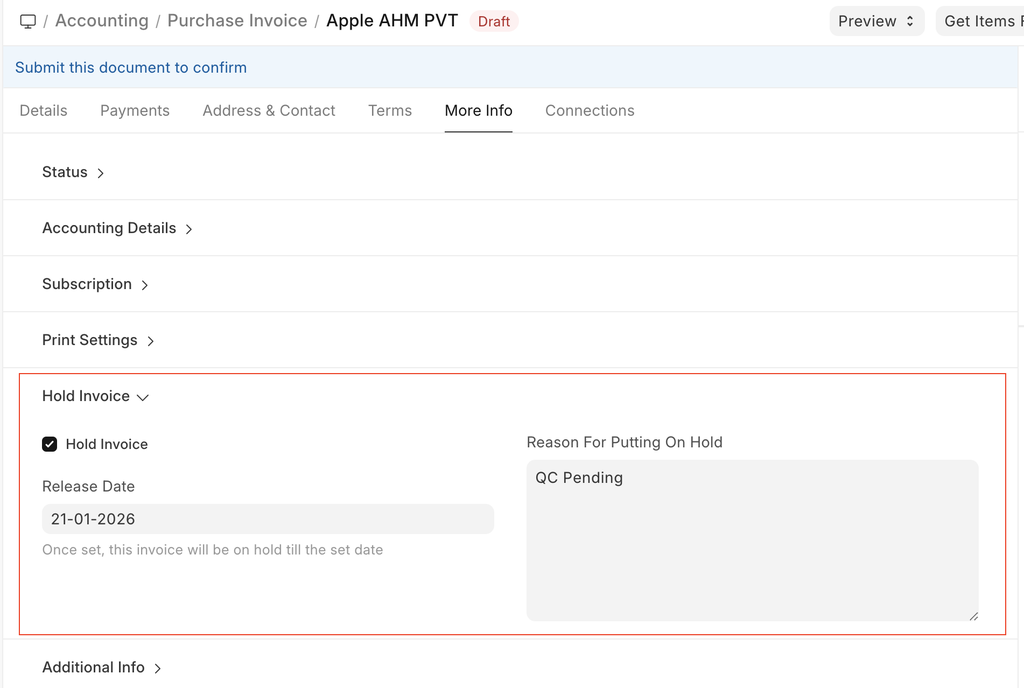 Once the purchase invoice gets submit and you want to change 'Release Date' then you can take the help of the 'Hold Invoice' button, which is available on the top right.