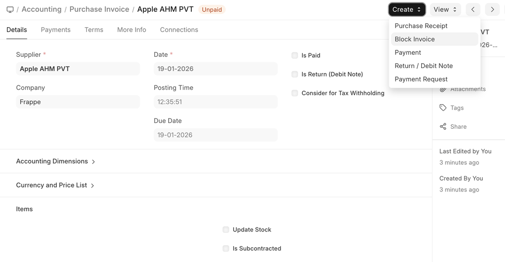 - You can only block or unblock a purchase invoice if it is unpaid.