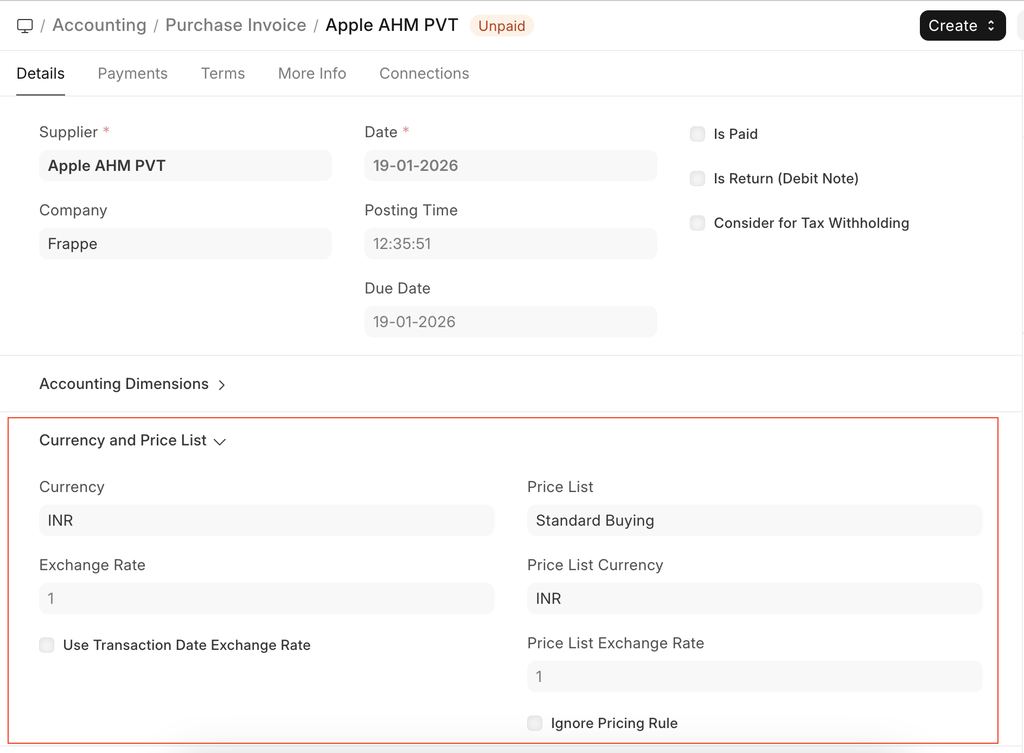 You can set the currency in which the Purchase Invoice order is to be sent. This is fetched from the Purchase Order. If you set a Pricing List, then the item prices will be fetched from that list. Ticking on 'Ignore Pricing Rule' will ignore the Pricing Rules set in Accounts > Pricing Rule.