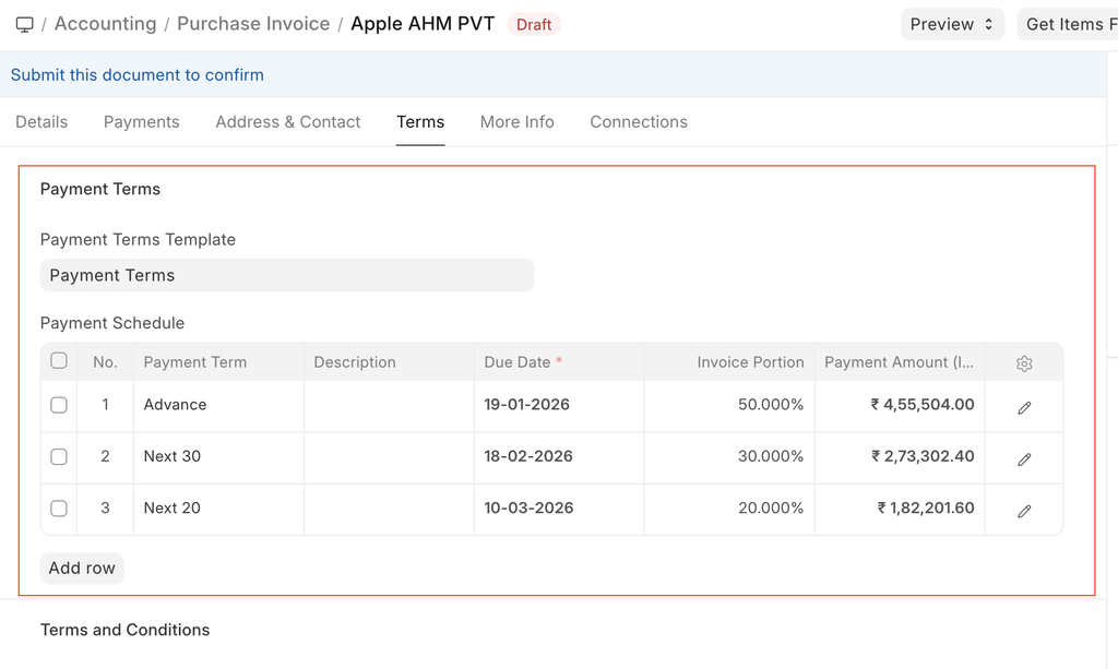 The payment for an invoice may be made in parts depending on your understanding with the Supplier. This is fetched if set in the Purchase Order.
