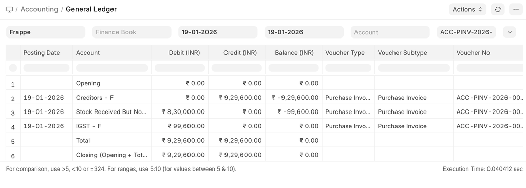 To see entries in your Purchase Invoice after you “Submit”, click on “View Ledger”.