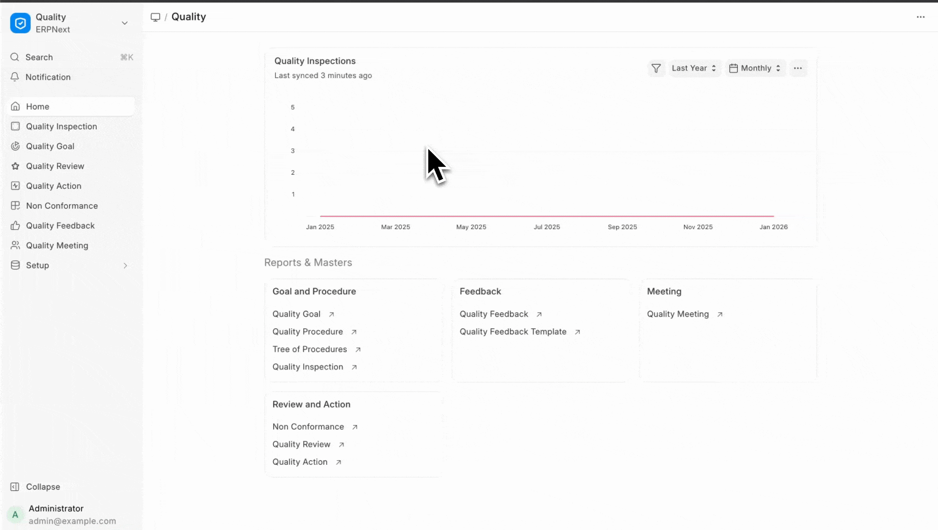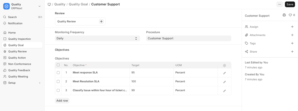 You can create a Quality Goal for your business having multiple Quality Objectives. Different Quality Objectives for a Goal can have definite numeric target or target measured in terms of completion status(yes or no). It is monitored based on Frequency which is set for that Goal.