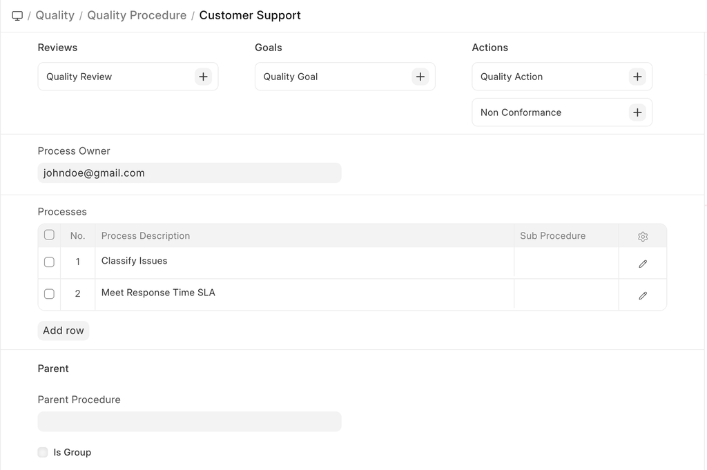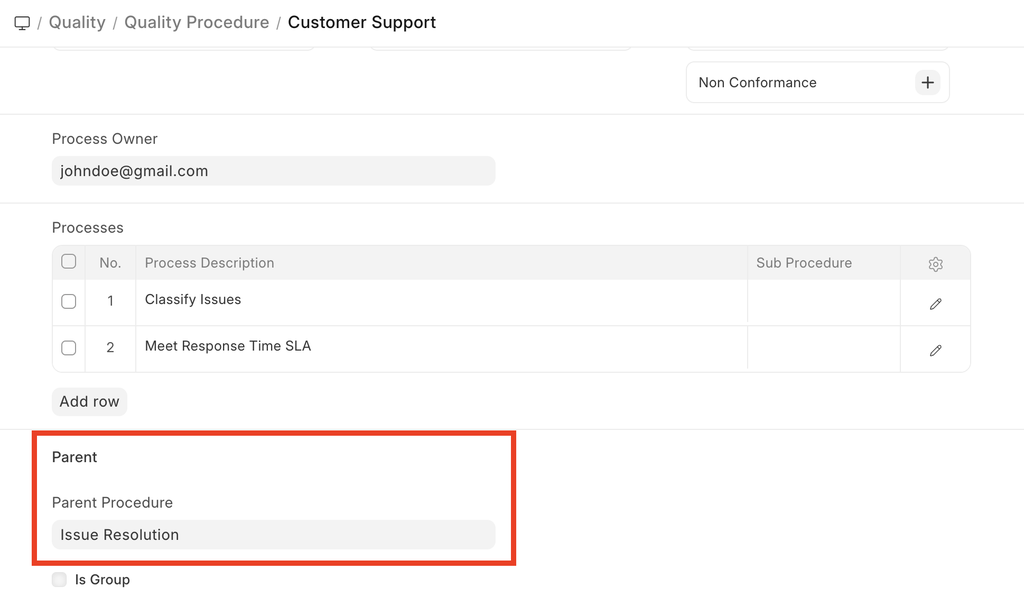 - Child Procedure: If the Quality Procedure being created a is a parent procedure that contains sub-procedures, link the sub-procedure here. On doing this, the current procedure becomes a parent and the 'Is Group' checkbox is enabled.