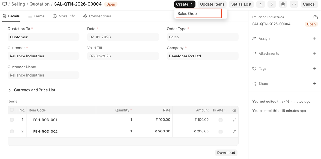 On submitting, you can create a Sales Order from the Quotation using the Create button. In the Dashboard present on the top, you can go to the Sales Order linked with this Quotation. In case it didn't work out, you can set the Quotation as lost by clicking on the 'Set as Lost button'.