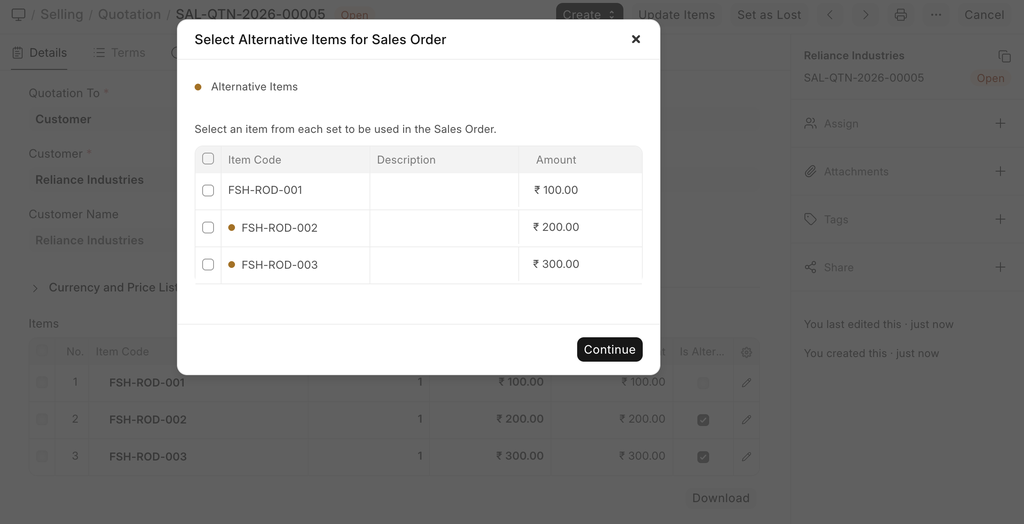 If the Quotation contains alternative items, you will be prompted to select from among alternatives while creating a Sales Order from the Quotation.