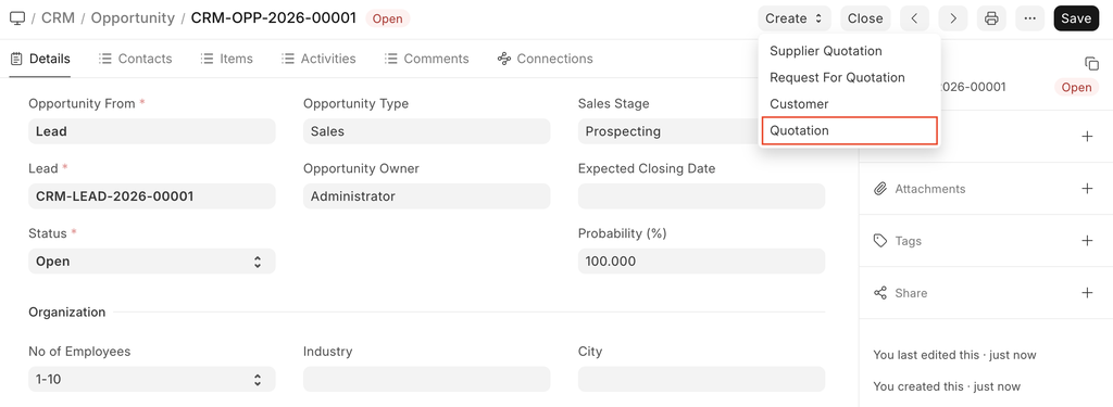 You can also create a Quotation from an Opportunity shown as follows.