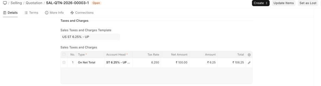 To add taxes to your Quotation, you can select a Sales Taxes and Charges Template or add the taxes manually in the Sales Taxes and Charges table.