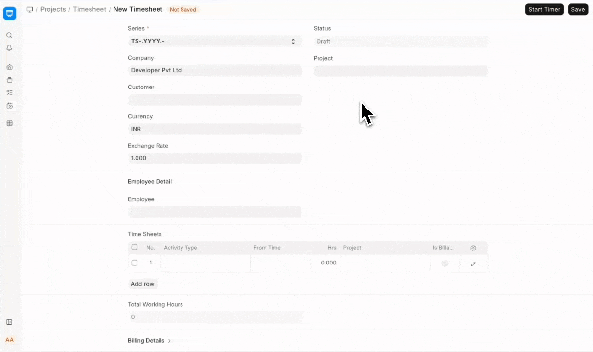 - All the details of the Timesheet will get auto-populated in the Sales Invoice.