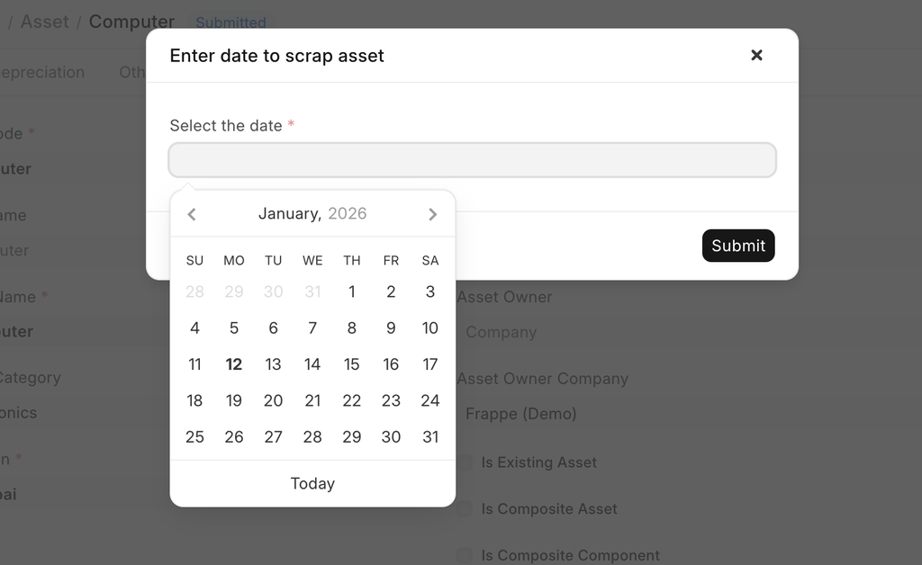 The scrapping date cannot be before the purchase date or it cannot be after the current date. Also, If the depreciation entries are passed, asset can only be scrap after the last depreciation date and not before it. In such cases depreciation entry needs to be manually cancelled first and then scrapping can be possible.