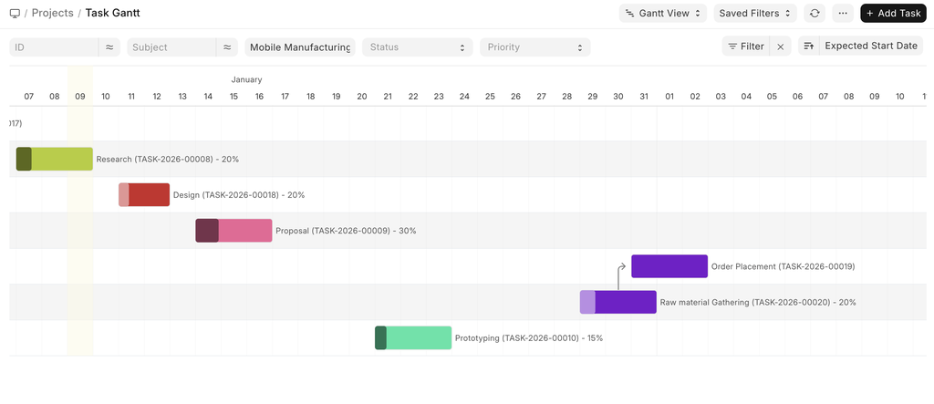 Task dependencies can be viewed in the Gantt Charts in the following way.