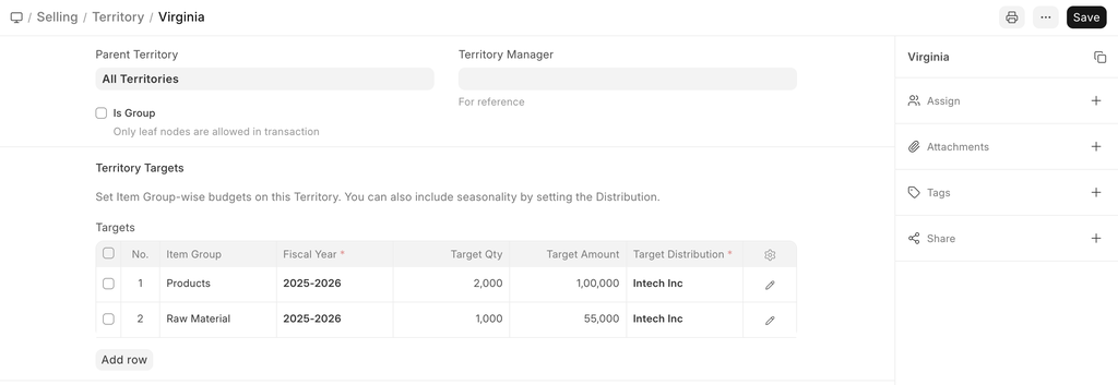 You can add multiple sub-territories under a parent territory. On saving, a territory can be selected in transactions and reports.