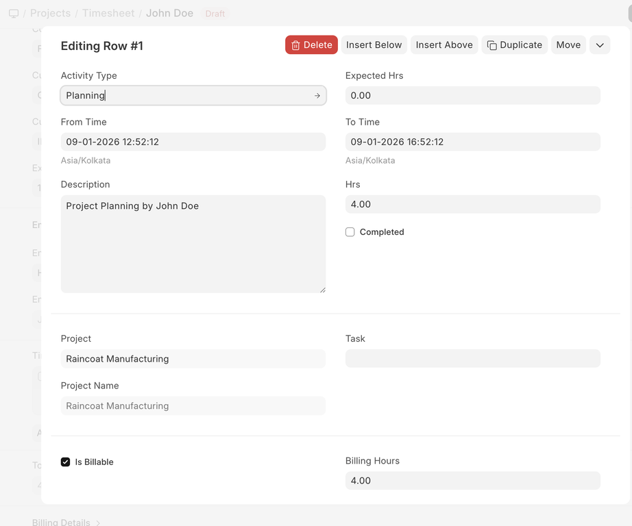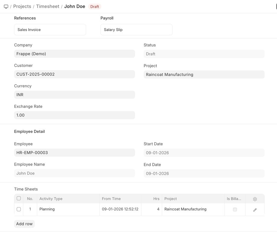 Once a Timesheet is saved and submitted, the details like Billing Rate and Costing rate get locked, and cannot be changed. The following DocTypes can be created after submitting a Timesheet.