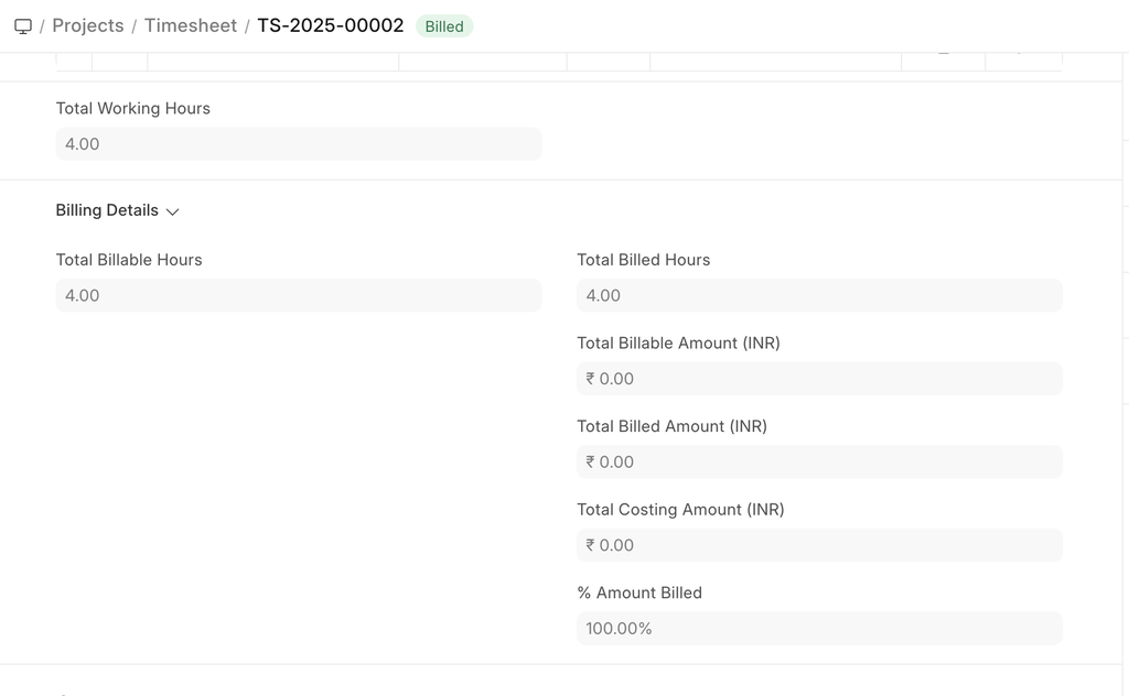 - % Amount Billed: Once the Timesheet is submitted, and a Sales Invoice is created from the Timesheet, the percentage of the Amount out of the Total Billable Amount which has been amounted for the Total Billed Amount gets calculated and is reflected here.