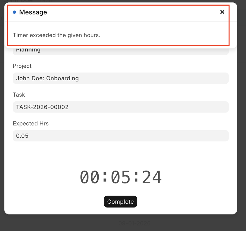 - If the time exceeds the 'Expected Hrs', an alert box appears.