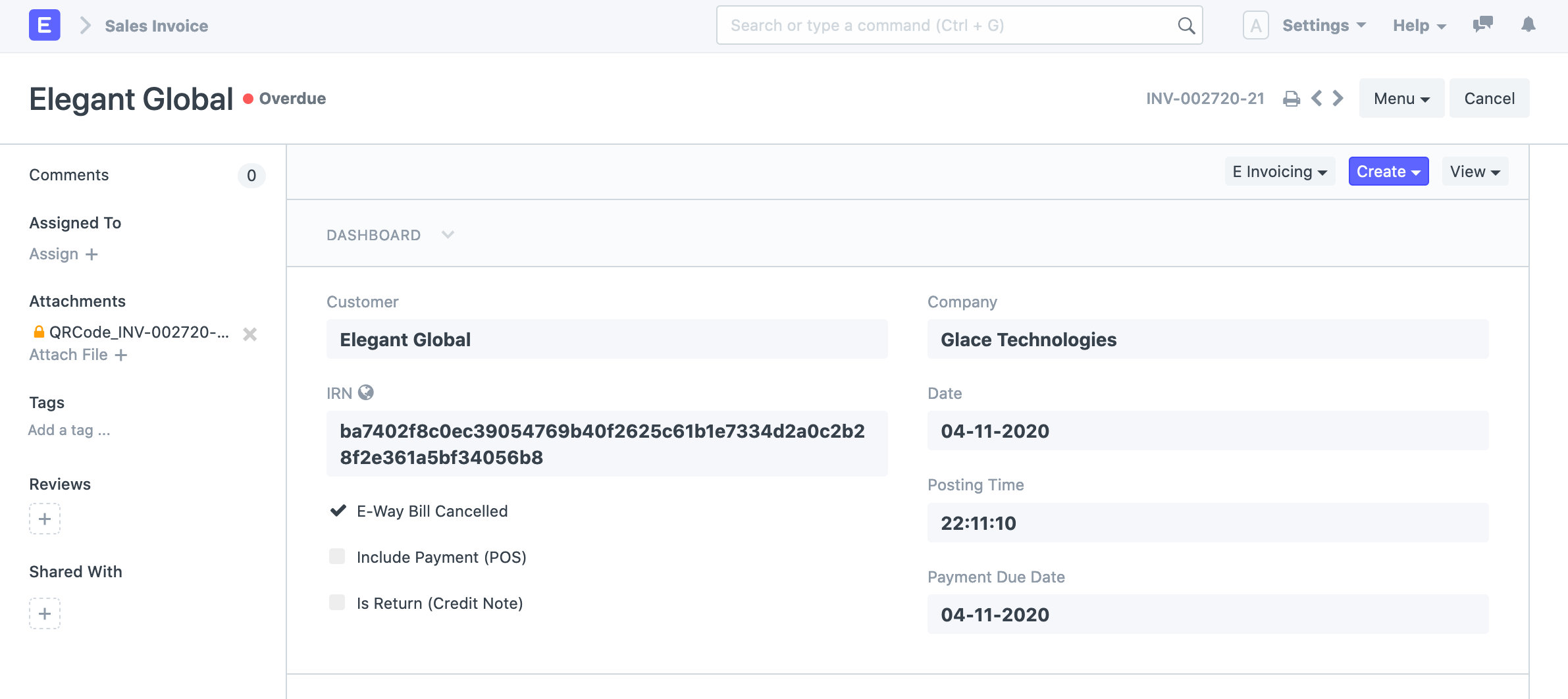 Create a Sales Invoice and keep it in the Draft state. Click on the E-Invoicing button group and then on Generate IRN. If the Sales Invoice doesn't have any validation errors, IRN will be generated and updated in the Sales Invoice. You can now submit the invoice and print the E-Invoice with QRCode image by selecting "GST E-Invoice" Print Format while printing.