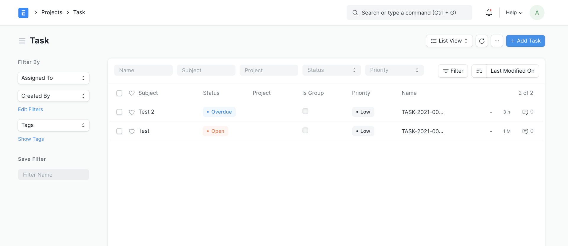 - Check the list view and form of a Task which has Status set as Overdue