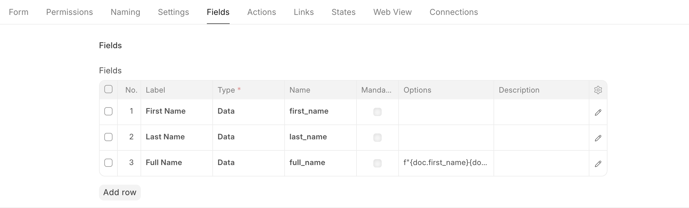 Here we've added three fields to Person; two for First and Last names which are stored in the site database, and one that utilizes this data to populate the third field "Full Name". In this instance, the options field takes input for the return value of the respective virtual field.