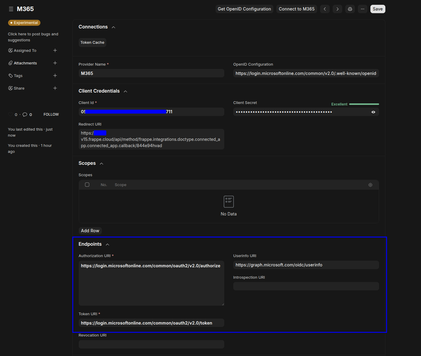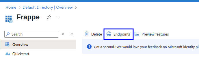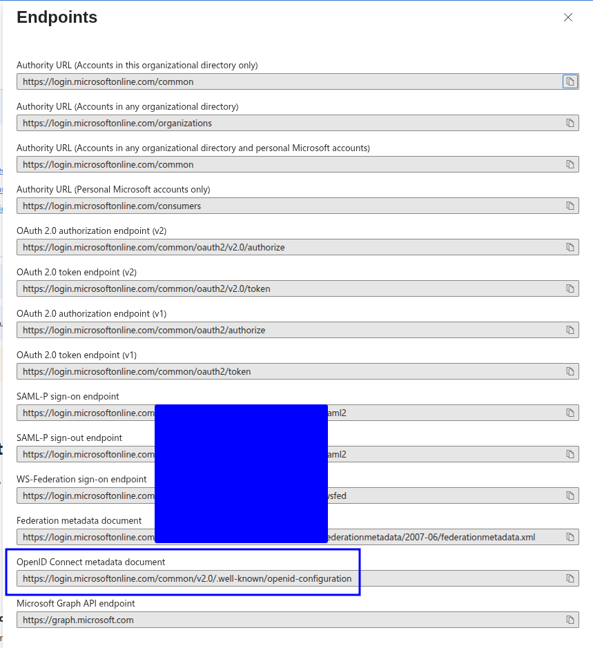 - Click on "Endpoints" and copy "OpenID Connect metadata document". This should be pasted into the "OpenID Configuration" field of your Frappe Connected App. After that, click "Get OpenID Configuration" on the Connected App, that will populate the endpoints.
