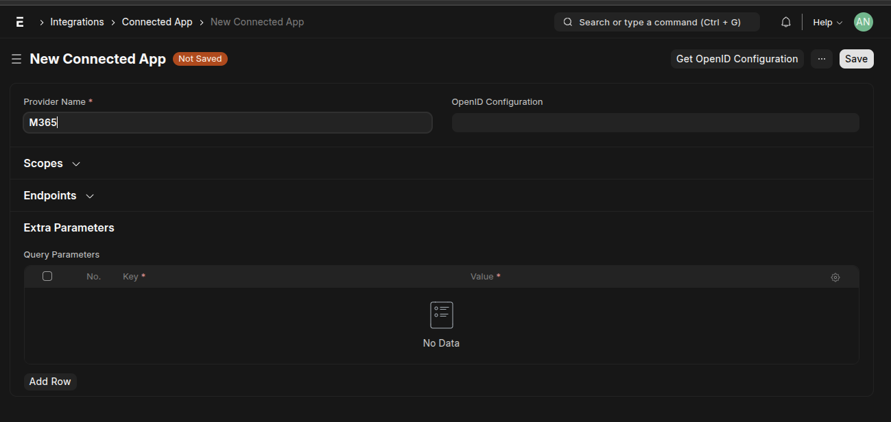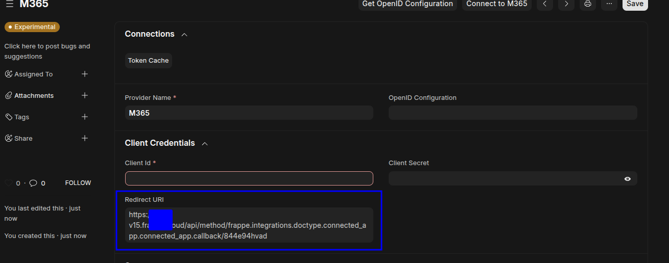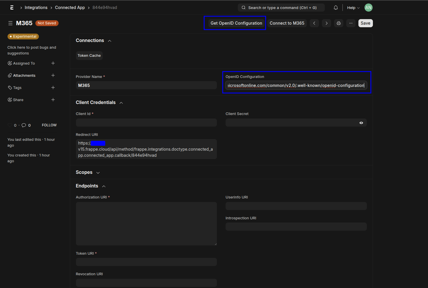 - Go to your Frappe instance and create a New Connected App and save it (just enter the name and save) and copy the Redirect URI for later.