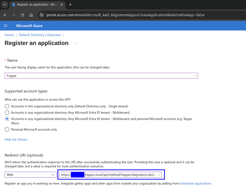 - Enter the respective details (app name, account type), paste the previously copied redirect URI from Frappe instance and select the platform as “Web”.
