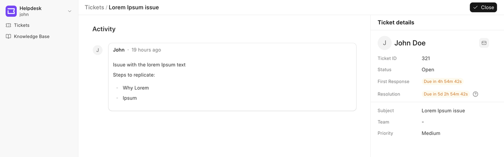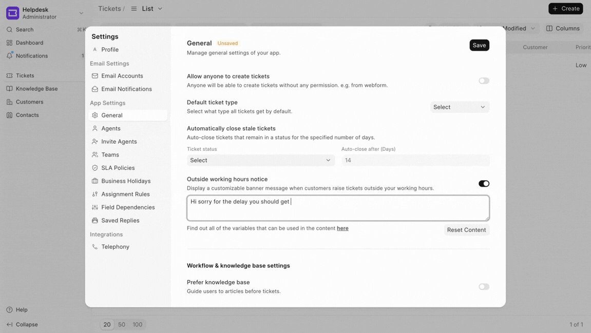{{ ticket.name}}— Ticket reference and other fields of the ticket can also be used. e.g: #TKT-00123{{ next_working_day }}— Full date with day name. e.g: Monday, 23 Jan{{ next_working_date }}— Short date format. e.g: 23 Jan{{ expected_response }}— Expected response time. e.g: 09:00, Monday, 23 Jan