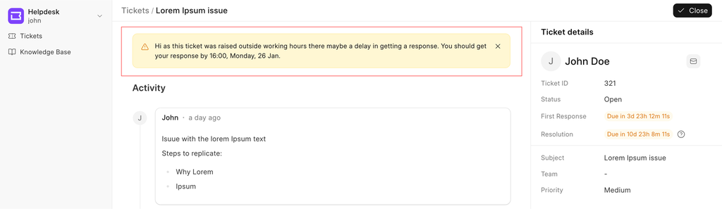 When users raise a ticket outside regular working hours, they may be confused about delayed responses. The Outside Working Hours Banner addresses this by notifying users of potential delays and setting clear expectations about response times.