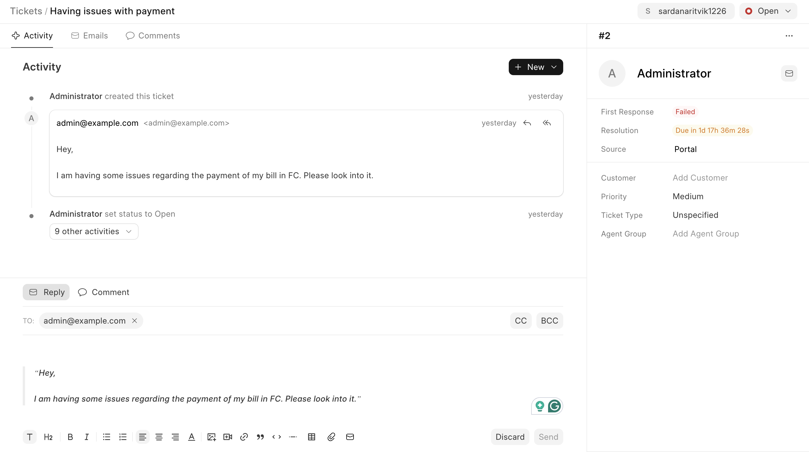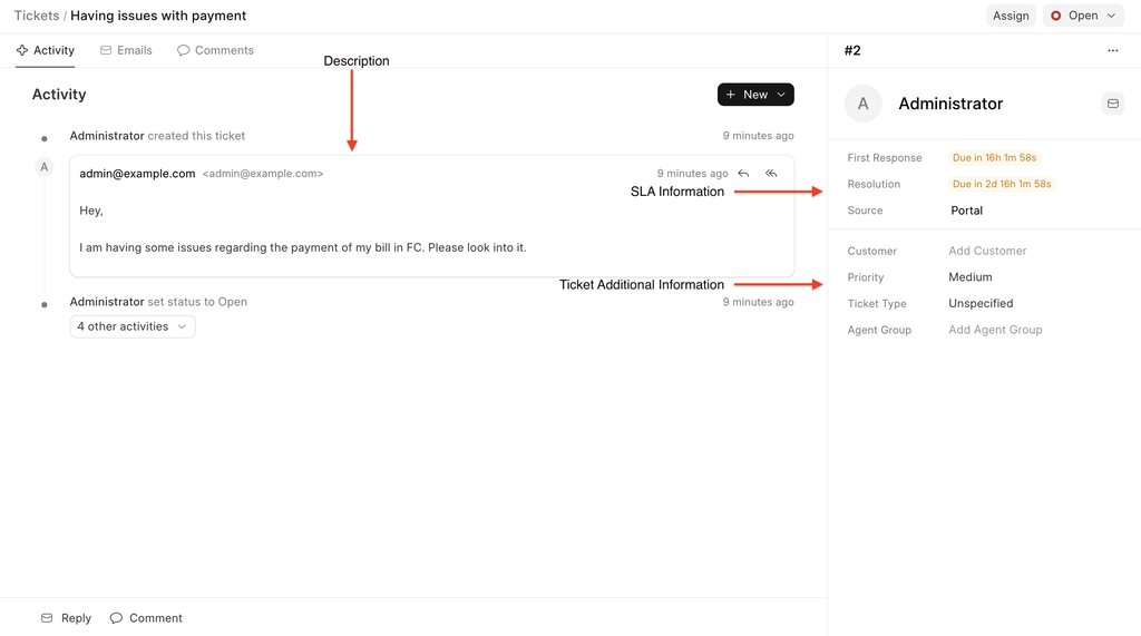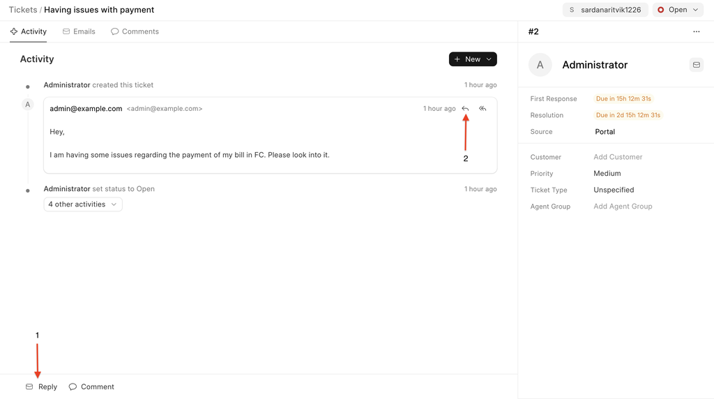 Let us try to assign this ticket to an agent, click on "Assign" button at the top