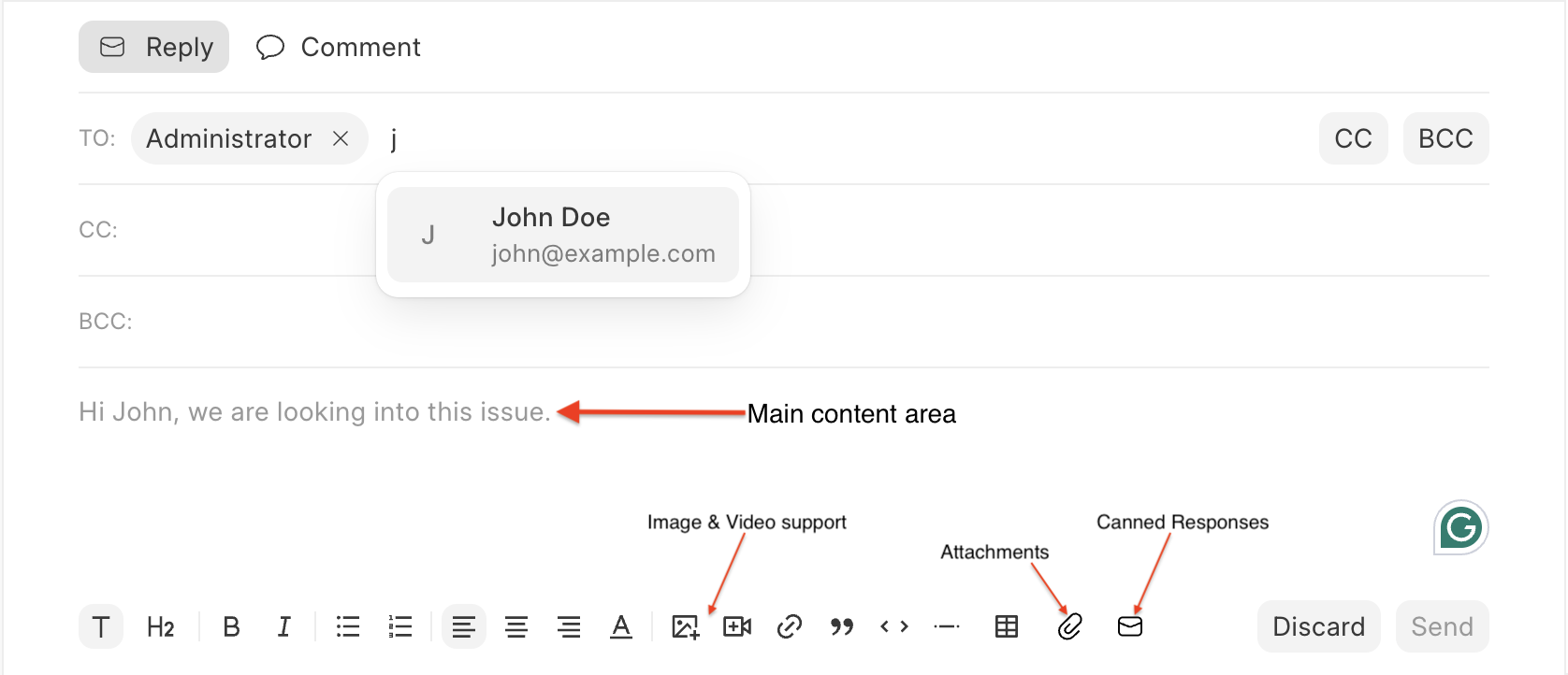 When you click on the reply button, a editor pops up. As soon as you click on it the "To" field automatically gets filled up by the person who has raised the ticket.