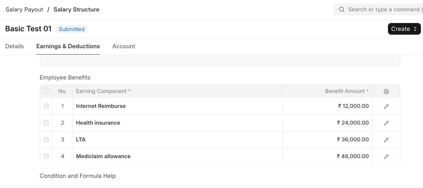 - Configure employee benefits and their yearly amount in the Salary Structure. This acts as the template for employee benefits.