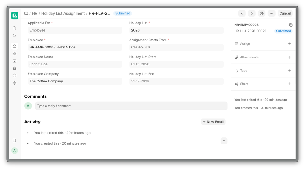 - Select the holiday list to be assigned. You can edit the Assignment Starts From date, this is the date from which the selected holiday list is applicable for the employee or company and remains applicable till the end of the holiday list, unless another assignment is created.