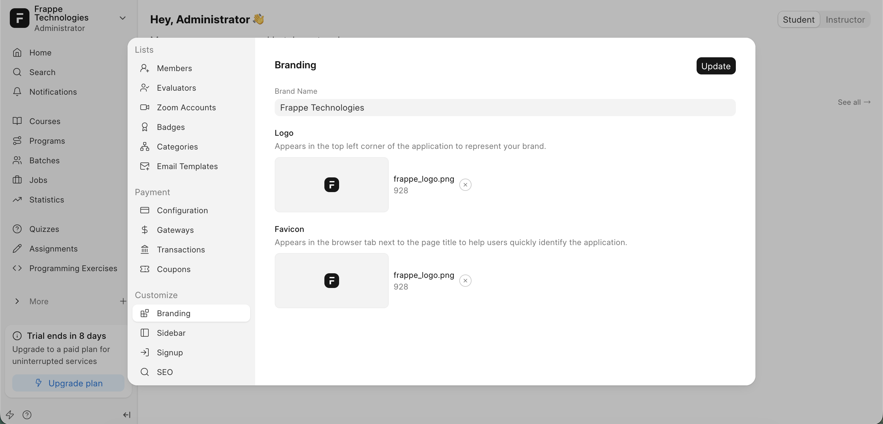 - Logo & Favicon: Upload your organization's logo for the sidebar and the favicon for browser tabs.