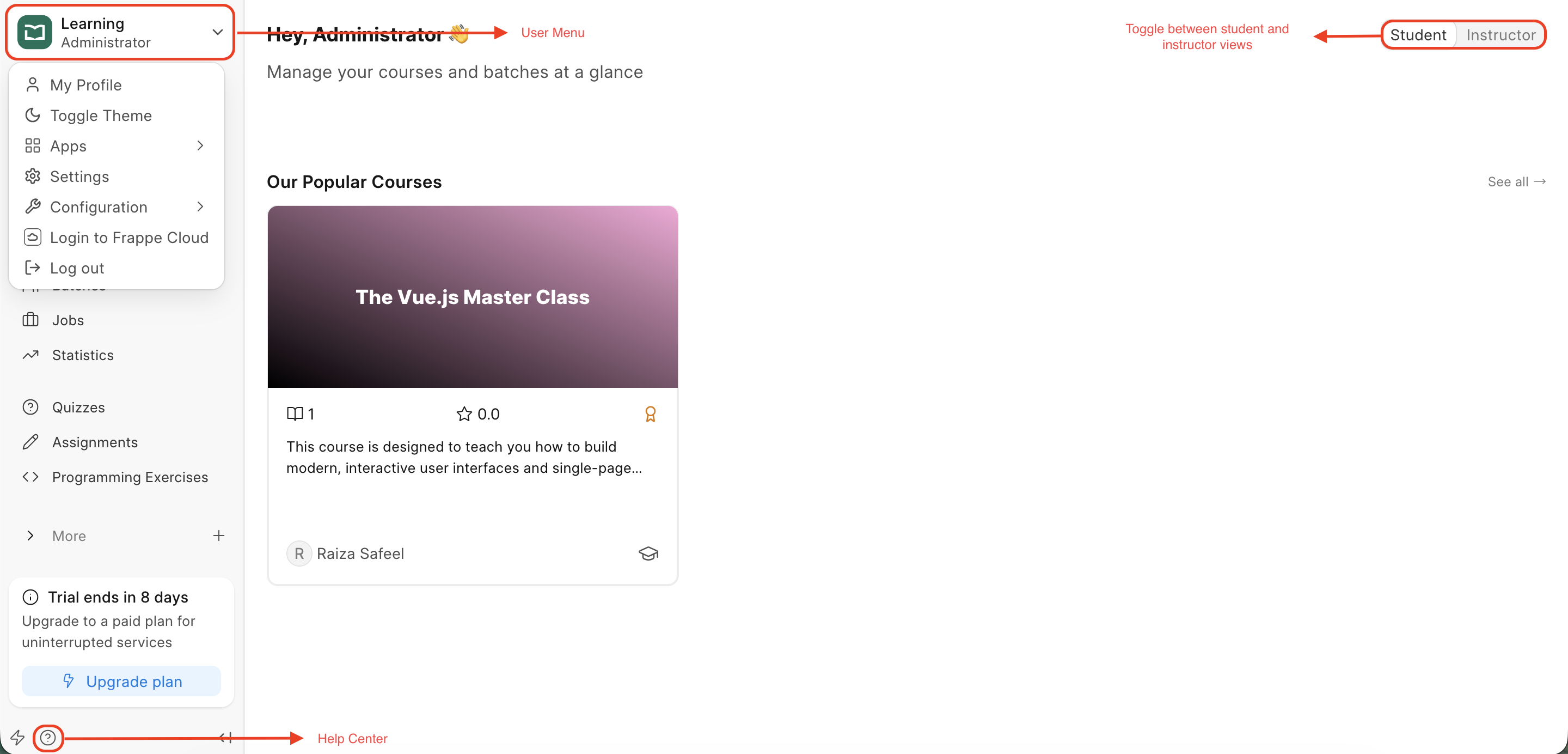 Frappe Learning operates across two distinct interfaces to separate student-facing content from administrative backend tasks.