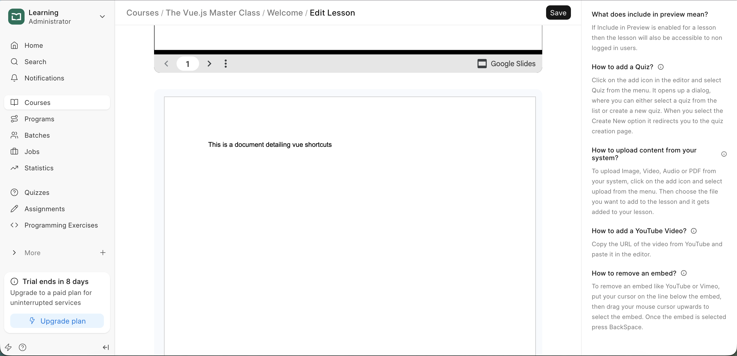 You can integrate live Google Docs, Sheets, and Slides into your lessons to provide dynamic, up-to-date documentation and presentations.