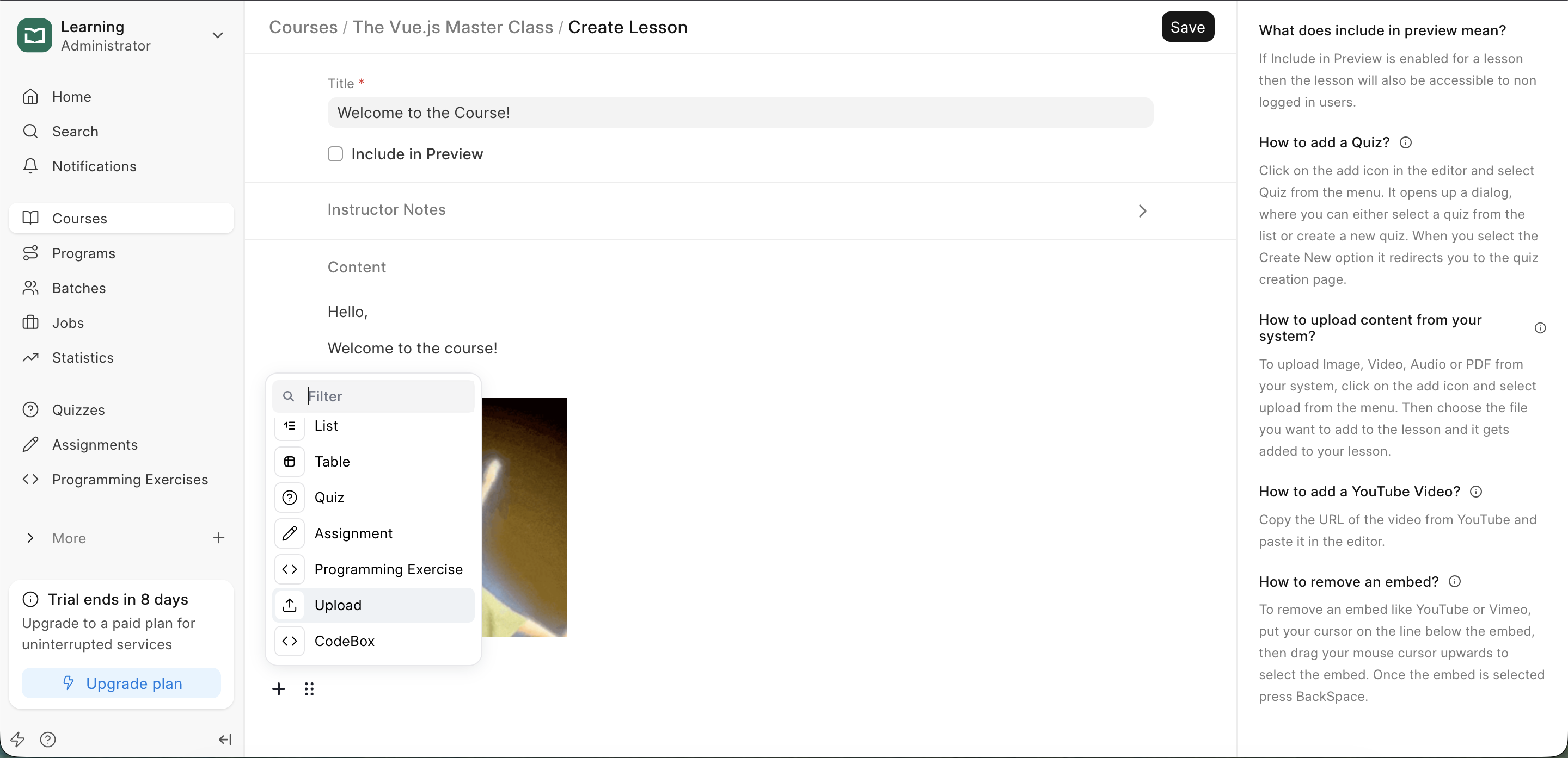 | Content | The rich-text editor for text, images, and embedded media. When you hover on the editor, a + icon will appear at the left of it. Click on the icon to open the lesson menu. You can select the type of content you want to add from the menu. | ❌ |