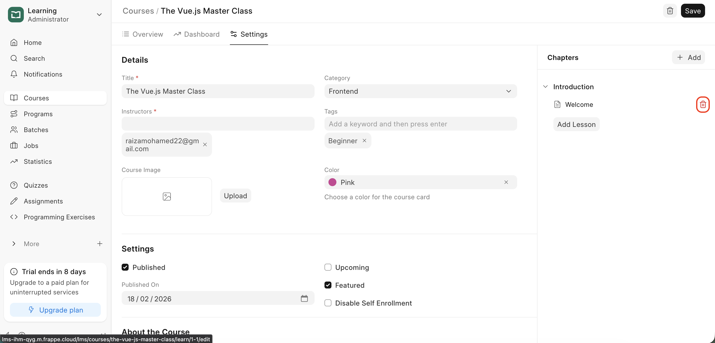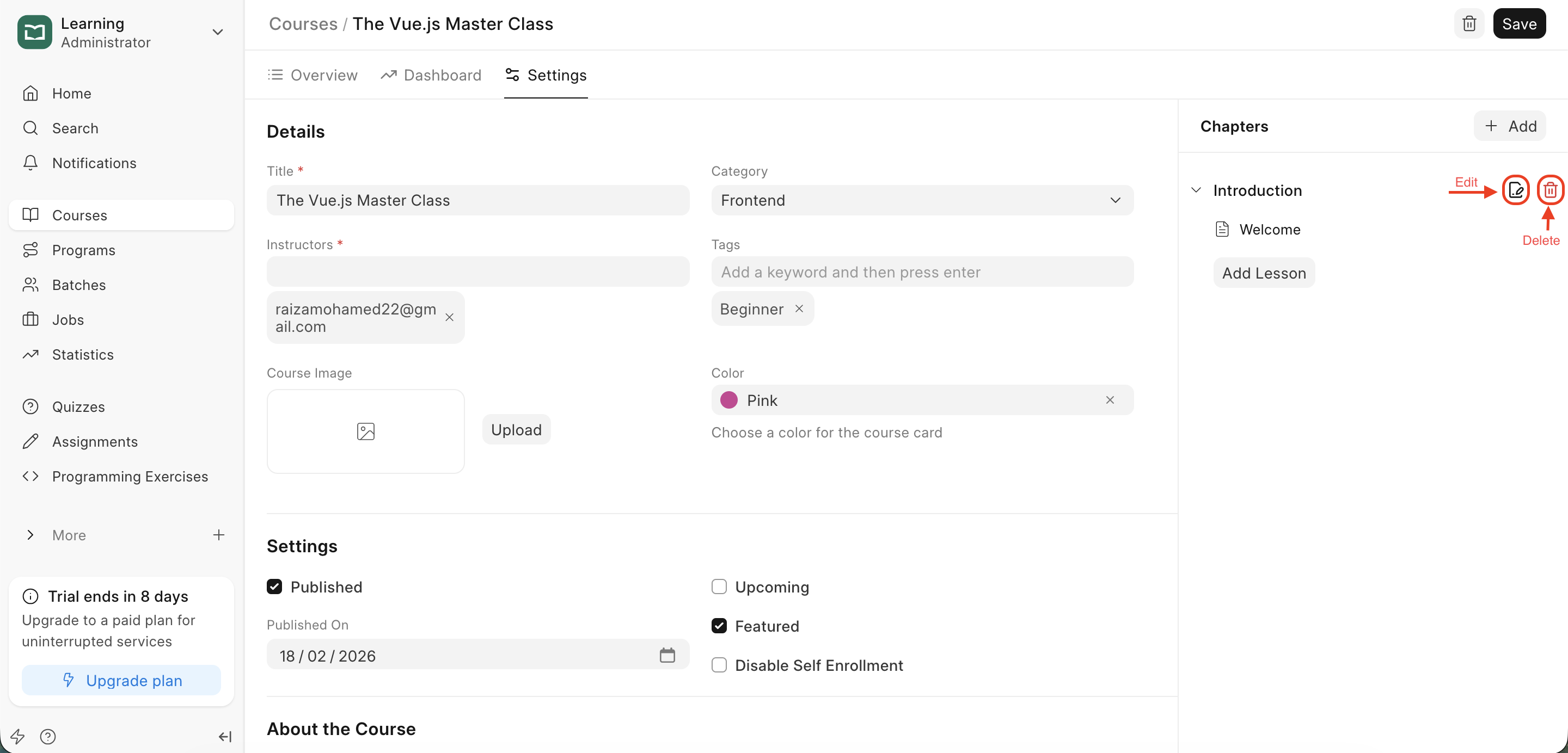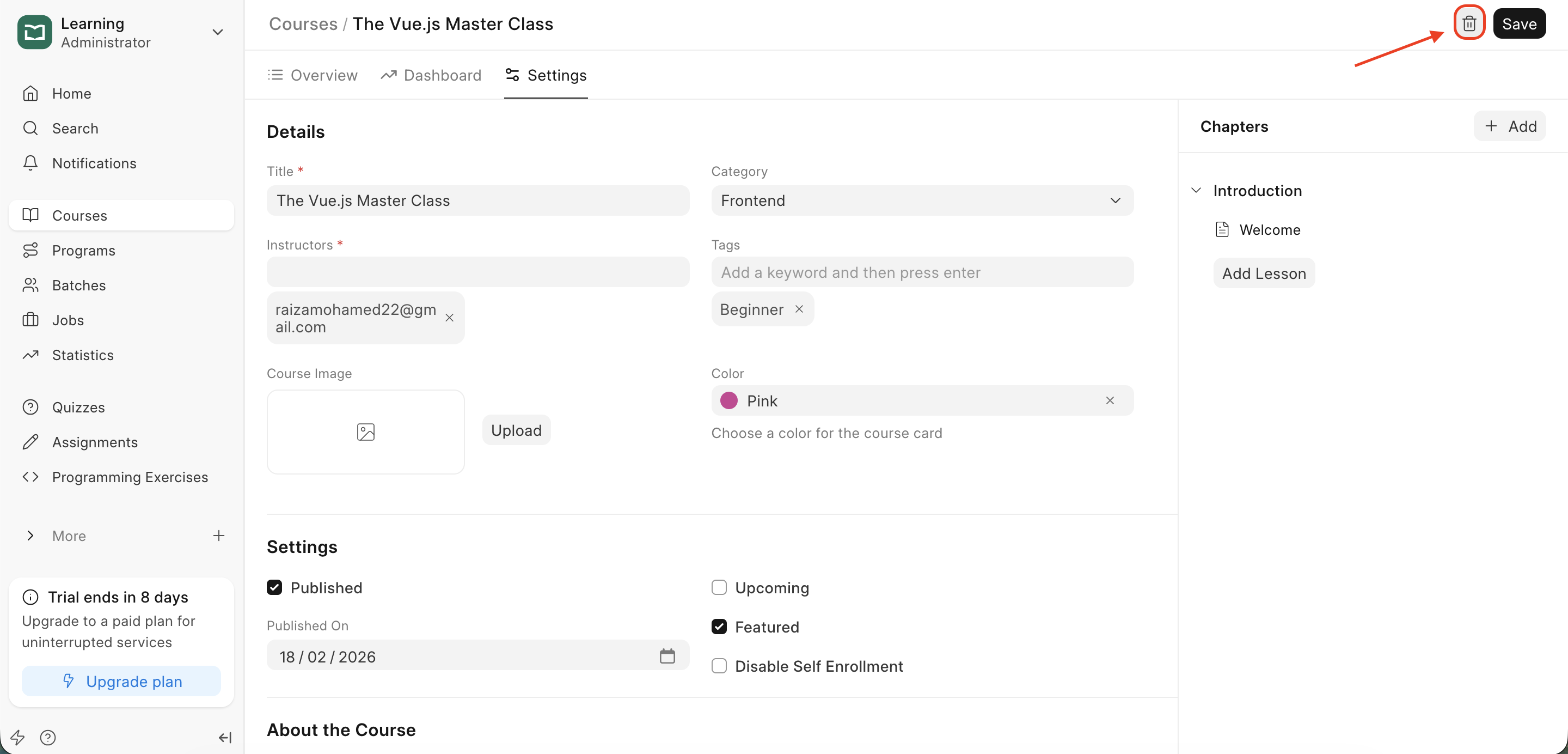 - To delete a chapter, hover over the chapter and click the trash icon on the same line. Confirm the deletion to remove the chapter and its associated lessons.