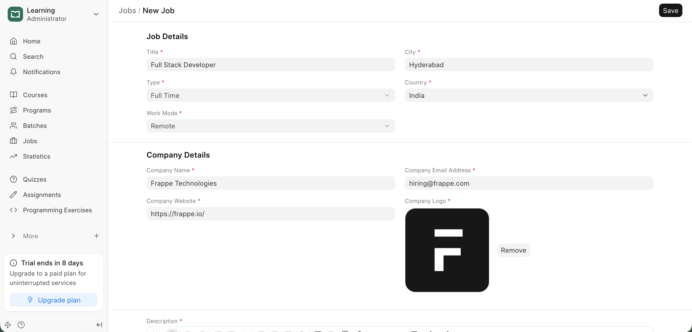 | Job Description | Use the rich-text editor to provide a detailed overview of responsibilities, requirements, qualifications, and benefits. |